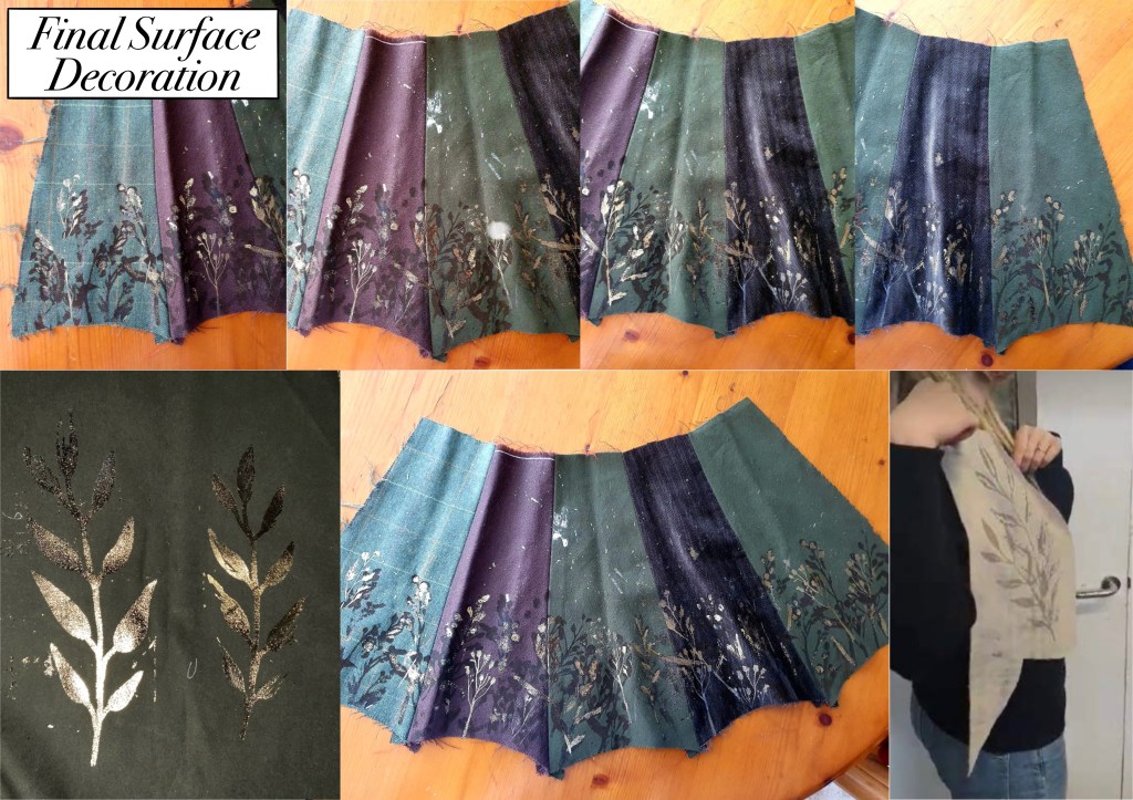 I also learnt a lot about perspective during this time in the dye room as we had to stop looking at the decoration up close as we will not be seeing it like that in the final product. We had to step away and look at how the foiling reflects and moves under the light. This is something that I hadn’t thought about previously so this was very helpful in teaching me about how your designs and costumes will be viewed and taking this into consideration when designing and making.