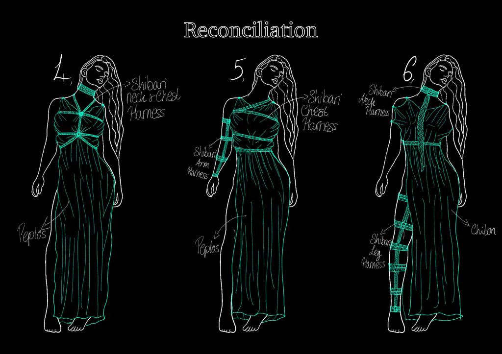 I added aspects of shibari and bondage to my designs which further made each costume somewhat individual to the character yet still worked as an ensemble. This is something that I found quite expressive and a unique way of portraying the character before adding colour and pattern. I was able to see the minimal bare bones of the costume that I could then build from. This is something I had not thought about doing previously with creating a base and building off of. I found it to be both freeing with not having to stress about what was underneath the details and also a way to push my creativity to develop new ways of layering and styling the shibari and the Chitons, peplos and himation’s.